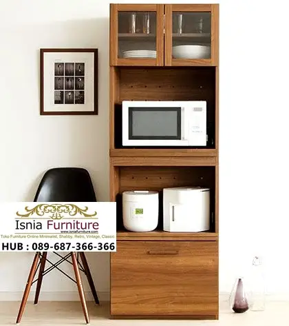 Dibuat dari bahan kayu berkualitas tinggi, lemari ini memiliki pintu kaca yang cocok untuk menyimpan piring, gelas, atau rempah-rempah agar terlihat teratur dan elegan. Dengan area terbuka khusus untuk microwave atau oven agar mudah diakses. Bagian bawah yang kuat juga bisa digunakan untuk menyimpan panci, wajan, atau persediaan makanan berat.