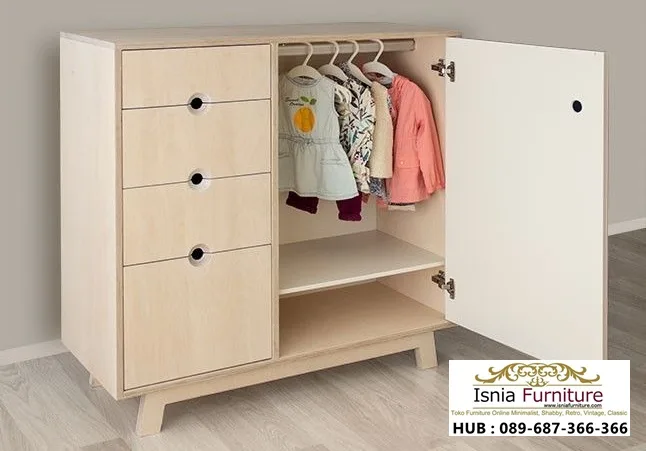 Terbuat dari kayu dengan permukaan alami yang lembut. Warna kayu yang terang memberikan kesan ruangan yang lebih luas dan nyaman bagi si kecil. Memiliki perpaduan laci tarik di sisi kiri dan area untuk menggantung pakaian di sisi kanan. Ini sangat berguna untuk memisahkan pakaian yang dilipat, kaus kaki, atau aksesori dari baju yang perlu digantung agar tetap rapi.