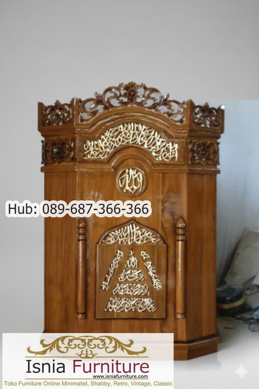 Secara keseluruhan, podium masjid dari bahan kayu adalah perpaduan sempurna antara fungsi, keindahan, dan ketahanan. Dengan material yang kuat, desain yang indah, serta sentuhan seni ukiran yang bernilai islami, podium kayu dapat menghadirkan suasana masjid yang lebih rapi, elegan, dan penuh makna spiritual. Podium ini tidak hanya menjadi pelengkap ibadah, tetapi juga cerminan kualitas dan keindahan sebuah masjid.