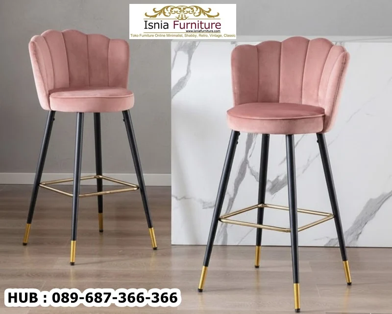 Produk kali ini adalah kursi bar dengan desain cantik. Kursi bar velvet merupakan pilihan yang populer untuk menciptakan suasana mewah dan elegan di dapur, bar pribadi, atau kafe, dengan desainnya yang modern dan kontemporer. Kursi ini umumnya memiliki rangka kayu, besi atau logam yang kokoh, namun tetap ramping.