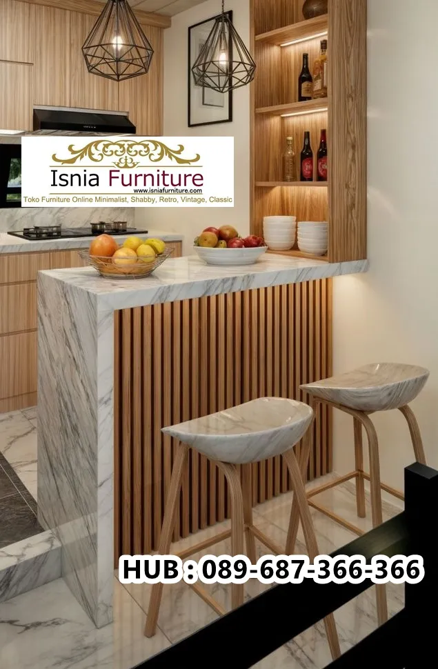 Desainnya fokus pada bentuk yang ringkas, tanpa ornamen berlebihan, sehingga menciptakan kesan ruang yang lapang dan rapi. Meja bar mini ini sangat cocok ditempatkan di dapur, ruang makan, bahkan pojok ruang tamu untuk menjadi area santai sambil menikmati kopi, wine, atau snack ringan bersama keluarga dan tamu.