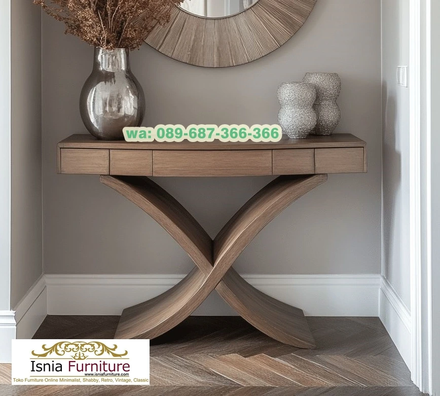 Meja Konsol Kayu Jati Laci Kaki Silang memiliki bagian laci pada meja konsol kayu jati dirancang untuk menambah fungsi penyimpanan tanpa mengganggu keindahan desainnya. Laci dapat digunakan untuk menyimpan barang-barang kecil seperti kunci, surat, aksesori, atau dokumen pribadi, sehingga area atas meja tetap rapi dan estetik. Sementara itu, desain kaki silang sangat sesuai untuk meja yang panjang, memberikan stabilitas yang baik dan mencegah meja goyang sehingga dijamin lebih kokoh dan tahan lama.