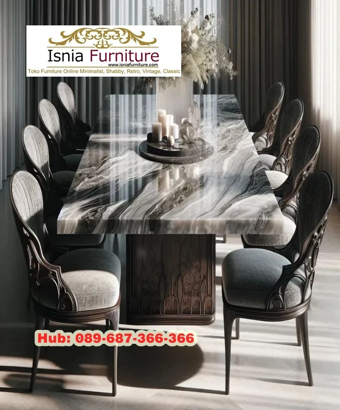 Kaki meja bukan hanya sekadar pendukung, tetapi juga elemen yang menonjol. Penggunaan kaki meja dengan desain yang mengagumkan dapat meningkatkan kesan elegan serta modern dalam interior ruangan. Dengan tampilan yang mengundang, Meja Makan Marmer Corak Unik Kaki Kayu ini bukan hanya sekadar tempat untuk meletakkan makanan, tetapi juga sebuah karya seni yang memperindah ruang. Furniture meja makan biasanya dilengkapi dengan kursi makan mewah agar menambah tampilan yang memukau. Bagian permukaan meja terbuat dari marmer alami dengan corak khas, baik berupa garis halus, abstrak, hingga gradasi warna yang menawan. Corak inilah yang memberi karakter kuat pada meja, menjadikannya tidak hanya sebagai tempat makan, tetapi juga sebagai karya seni alami yang mempercantik ruang makan. Marmer juga memiliki permukaan halus, berkilau, dan tahan panas, sehingga sangat fungsional untuk penggunaan sehari-hari.