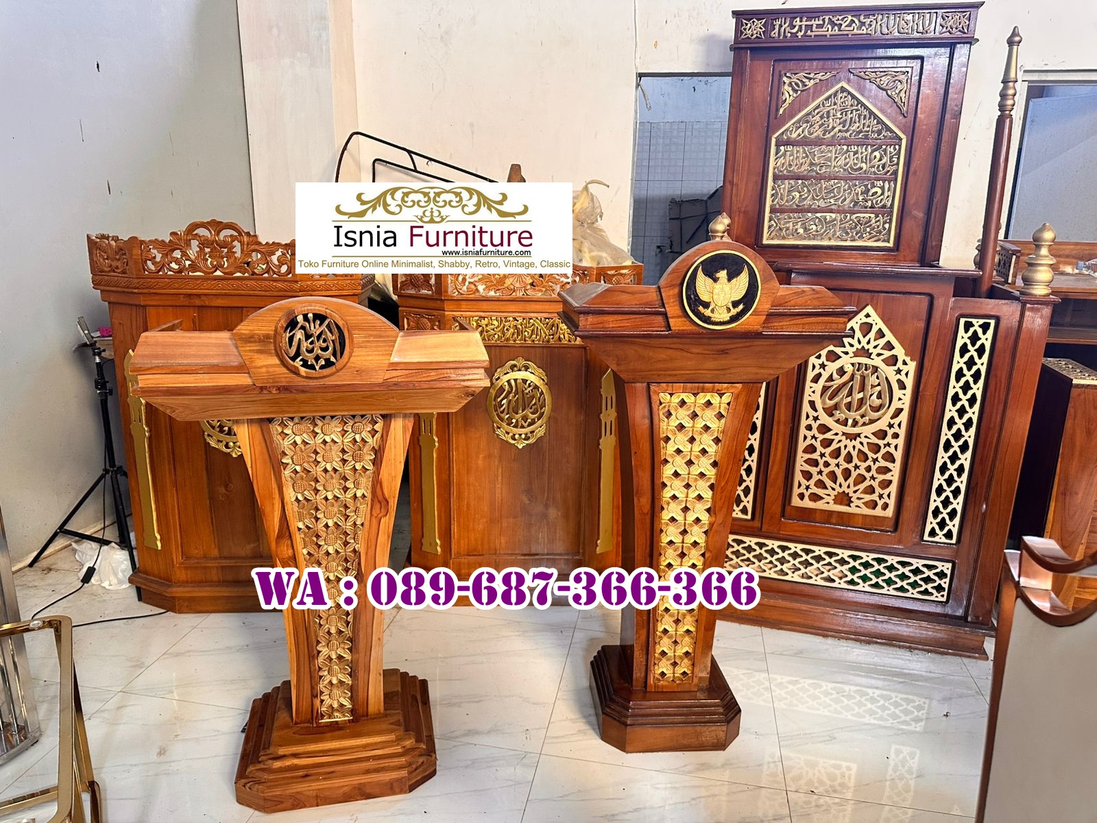 Podium Masjid Kota Garut ini terbuat dari bahan kayu jati yang terkenal dalam hal kekuatan, keawetan, dan daya tahan terhadap rayap. Kayu jati memiliki serat yang indah dan warna yang menarik, sehingga podium yang terbuat dari kayu jati akan menambah keindahan masjid. Kandungan minyak alami dalam kayu jati membuatnya lebih awet dan tahan lama, membuat podium tidak mudah rusak atau lapuk. Podium ini juga dilengkapi ukiran dan kaligrafi yang indah sehingga terlihat islami dan menarik. Kota Garut terletak di Jawa Barat. Garut terkenal adalah keindahan alamnya yang memanjakan mata. Beberapa daya tarik alami yang wajib Anda kunjungi di Garut meliputi, Gunung Papandayan dan Gunung Cikuray. Pilih Podium Masjid Kota Garut untuk melengkapi masjid Anda agar lebih terlihat indah dan mewah.